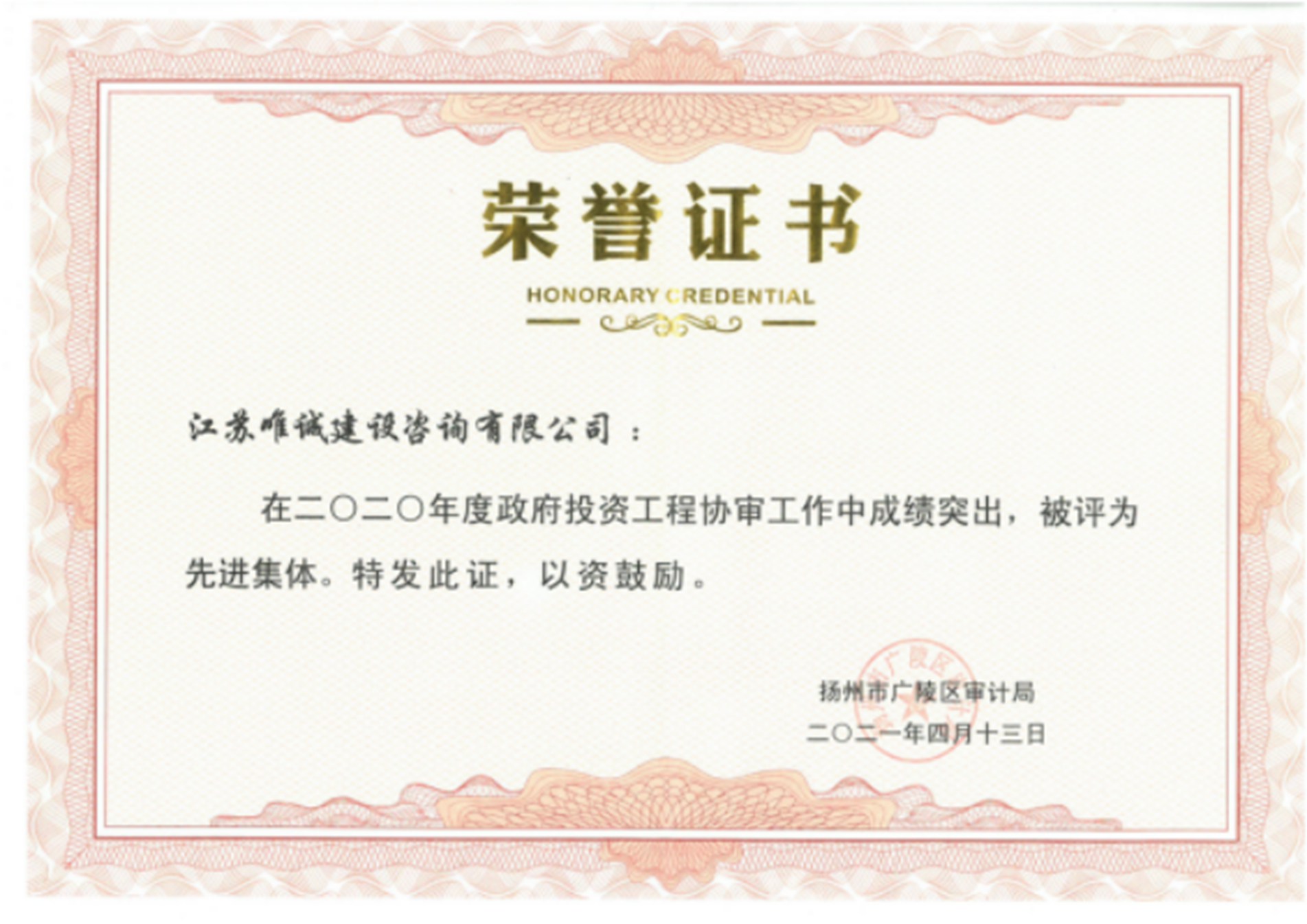 江苏唯诚建设咨询有限公司成立于 2000 年 9 月,地址商城国际大厦 19F。公司具备造价咨询甲级、招标代理甲级,以及政府采购、工程咨询、项目管理、稳评等多项资质,是江苏省住建厅全过程咨询试点企业。公司获得扬州市政府表彰 2020 年度建筑业先进企业、全国工程造价信用等级 AAA(最高级)、江苏省工程造价信用等级 AAAAA(最高级)、扬州市建筑业信用等级绿牌(最高级)、江苏省建设工程造价协会优秀单位会员、扬州市优秀造价咨询单位、全国招标代理诚信单位、江苏省优秀招标代理机构等各项荣誉。江苏唯诚建设咨询有限公司党支部 2021 年 6 月荣获江苏省住建行业党委“先进基层党组织”表彰。